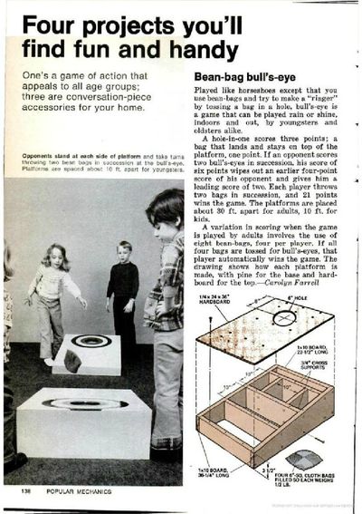 In 1974, an article appeared in the September issue of Popular Mechanics magazine which contained instructions about how to build a bean bag game. This is believed to be the first widely published picture of what a modern cornhole set was supposed to look like. It measures 36" X 24" - a foot shorter than a regulation set. The hole is located 8" down on center from the back edge of the board instead of the current 9".(possibly a mistake by the author)